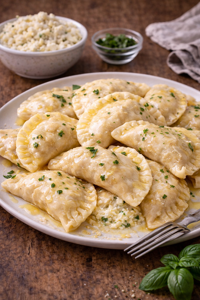 Combine first 3 ingredients. Work together with hands. Gradually add water until dough forms a ball. Roll out half of dough 1/8″ thick on floured surface. If dough appears sticky, dust with flour. Cut circles using a 3″ round cookie cutter or glass. Fill each piece of dough with 1 heaping tsp. of filling (see recipe below). Fold over and pinch edges. Press edges with fork to secure. Place on floured pan to prevent sticking. Place in 2 quarts of boiling water. Cook 5-7 minutes or until pierogi floats to the surface. Serve hot, drizzled with butter.