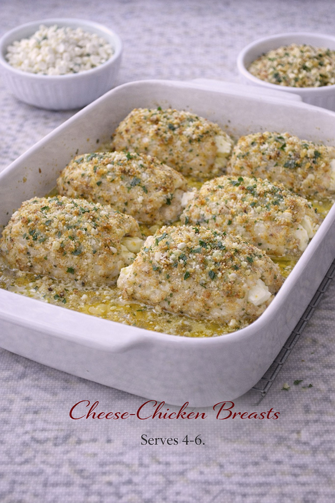 Place chicken breasts on cutting board & pound lightly to measure about 5 x 5 inches. Place cheese slice in center & roll up, tucking in sides. Secure with toothpicks if necessary. Combine bread crumbs, parmesan cheese & parsley. Dip chicken in melted butter & then roll in crumbs. Place in shallow baking pan & pour remaining butter over breasts. Cover with foil & bake in 350 oven for 25 minutes. Remove foil & continue baking for another 20 minutes.