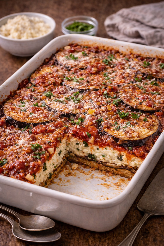 Meanwhile. heat 2 TBSP. oil in medium-size fry pan: stir in onion & garlic salt & cook over medium heat about 5 minutes. Remove ¼ cup of this mixture for later. Add tomato sauce & Italian seasoning to fry pan & bring to boil: lower heat & simmer 5 minutes. In medium mixing bowl, place reserved onion mixture. cheese. wine. eggs. salt. pepper & parsley. Mix well. Spread thin layer of tomato sauce in bottom of 13 x 9 x 2 pan. Arrange half eggplant slices over sauce: spread with cheese mixture & top with remaining eggplant. Pour tomato sauce over eggplant & sprinkle with parmesan cheese.