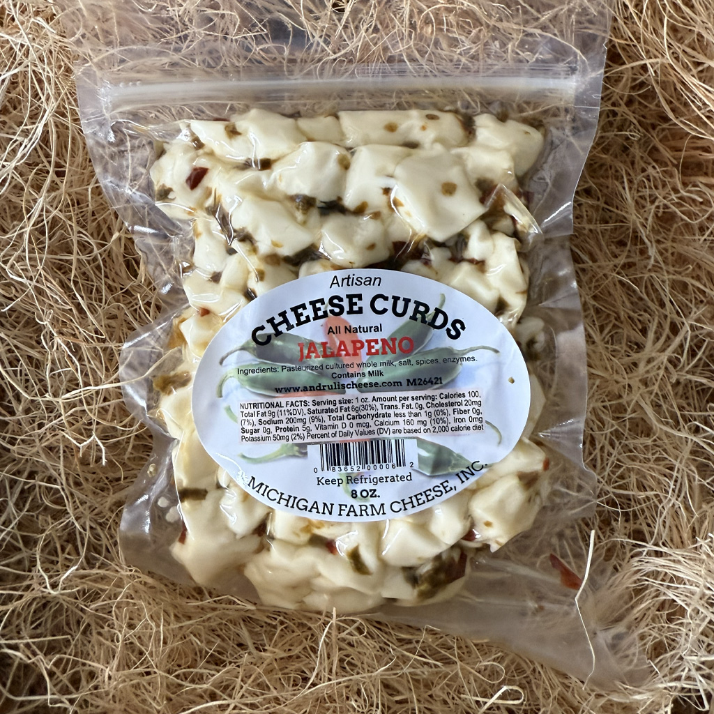 An all time party favorite, Andrulis jalapeno cheese curds bring just the right amount of heat to wake up your snack table. Handcrafted in small batches with farm fresh milk and seasoned with real jalapeno spices, these curds will tantalize the taste buds of any spicy connoisseur. Whether you’re building a snack plate, hosting a get together, or just craving something bold, these curds deliver a punch of flavor that’s impossible to resist. Straight from the heart of local Michigan farming.