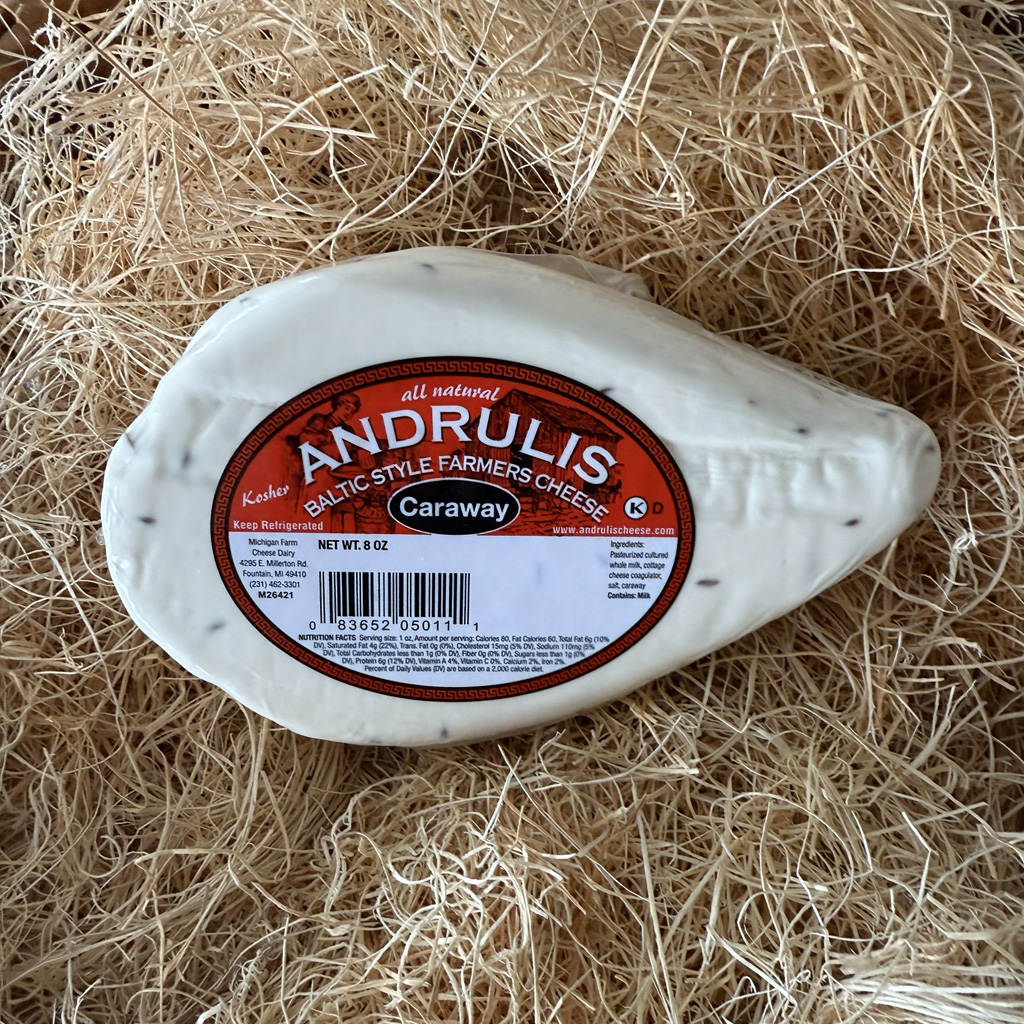 A classic in many Baltic and Eastern European kitchens, caraway seed cheese brings a warm, nutty flavor to the mild creaminess of Andrulis Farmers Cheese. Each bite combines soft texture with the gentle crunch of caraway seeds, making this a nostalgic favorite for those who grew up with traditional flavors and a flavorful discovery for those who didn’t.